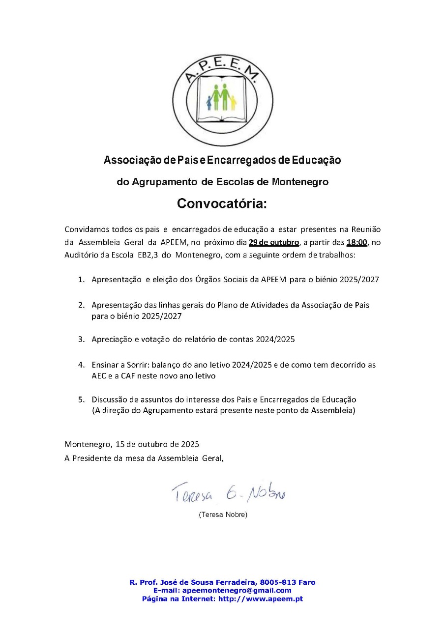 A Assembleia vai-se realizar no próximo dia 29 de outubro, a partir das 18:00, no Auditório da Escola EB2,3 do Montenegro, com a seguinte ordem de trabalhos: